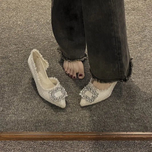 Stiletto Heels 2024 White Wedding Shoes Fashion Pointy Square Button Rhinestone Sandals Temperament Women's Women's Shoes