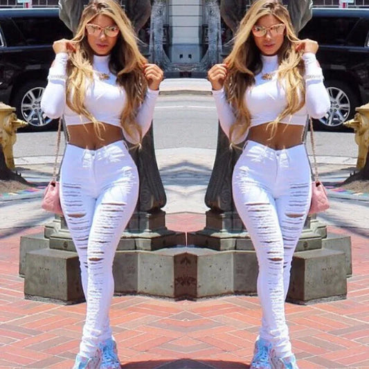 European and American Style High-waisted, Ripped Stretch Denim Long Pants for Women, Tight, Hip-lifting, Small-leg Pencil Jeans