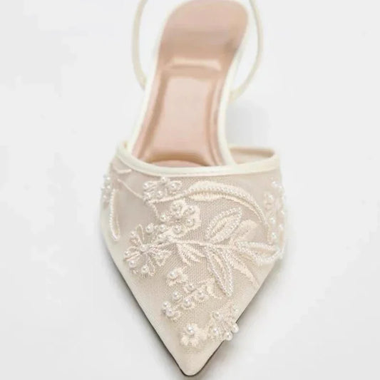 Mesh Embroidered Flowers Thin Heels Sandals Women 2025 Summer Sexy Slingback Pointed Toe Pumps Dress Shoes Sandalias De Mujer