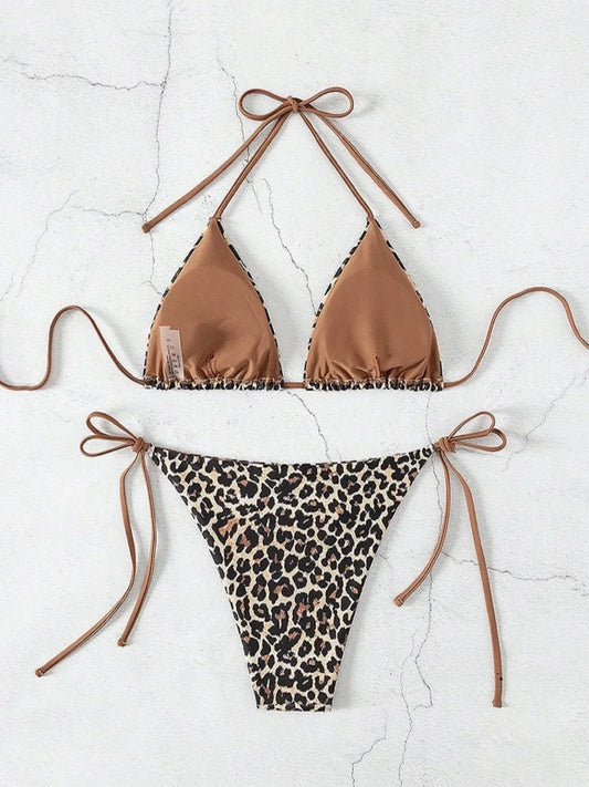 Sexy Leopard Print Two Piece Swimsuit Set Triangle Bra Suspender Halter Backless Bikini Set Beach Vacation Lace-up Swimwear 2025