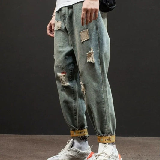 Men Washed Distressed Jeans Pencil Pants Mid Waist Denims Vintage Pockets Button Zipper Fly Streetwear Ankle Length Trousers