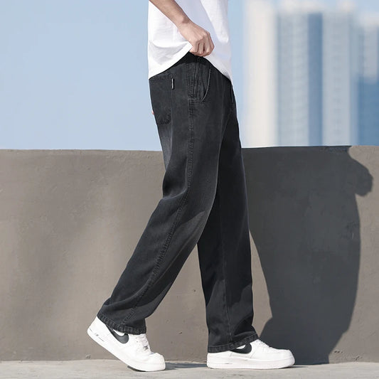 Spring & Summer Essential! Men's Tencel Jeans, Thin Ice - Silk Fabric, High - Street Loose Straight Cut, Drapey, Elastic Waist w