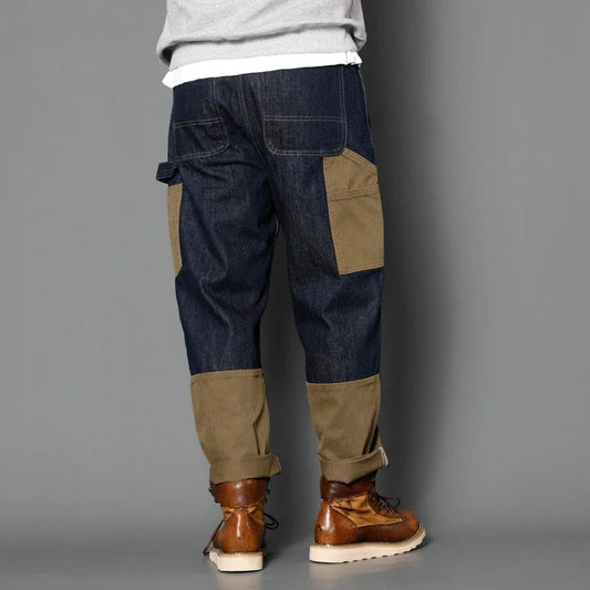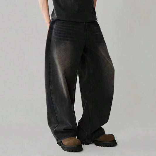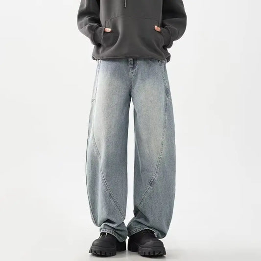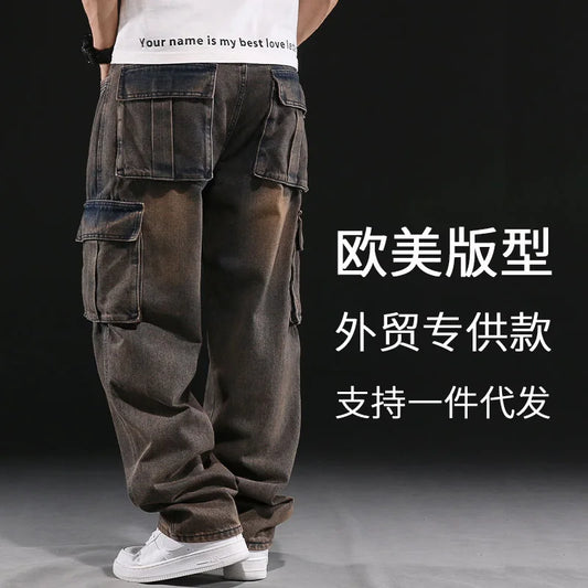 Men's Baggy Denim Cargo Pants Multi-Pocket Wide-Leg Jeans Vintage Washed Loose Fit Streetwear Style