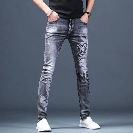 Trendy Luxury Clothing Men Korean Casual Denim Jeans Printed Patterns Slim Designer Spring Autumn Streetwear Cotton Trousers
