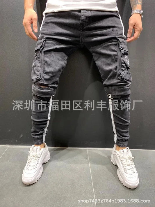 2025 Street Elastic Jeans Men Denim Cargo Pants Wash Solid Color Multi Pockets Casual Mid Waist Trousers Slim Daily Wear Joggers