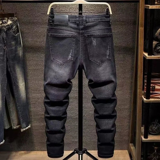American High Street Men's Jeans Trendy Ripped Worn-out Hole Punch Elastic Straight Cut Slim Fit Streetwear Pant for All Seasons