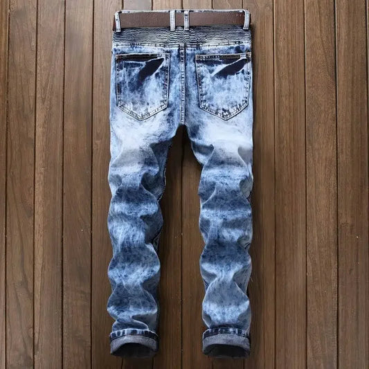 Mens Distressed Pleated Knee Patch Painted Stretch Skinny Jeans Ripped Denim Pants Brand Hip Hop Black Casual Trousers for men