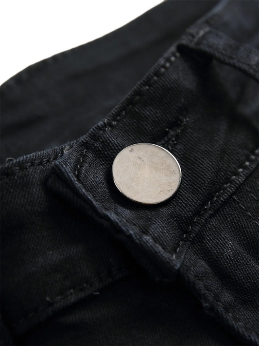 Black 90% Cotton Men Retro Wash Distressed Stretch Ripped Jeans Tight Hole PATCH Denim Pantalones Printing Zipper Joggers