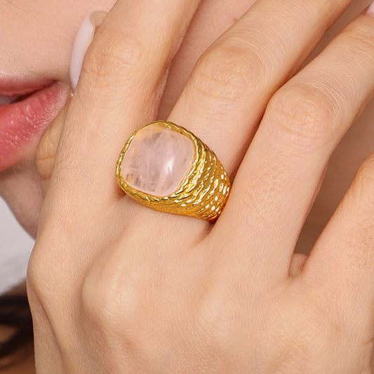 Vintage Knited Design Stainless Steel Rings For Women Pink Square Natural Stone Couple Finger Ring Waterproof Jewelry Gift
