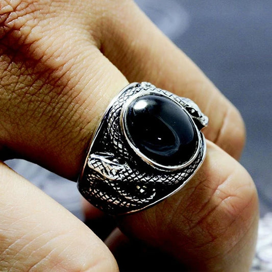 Punk Black Gem Stone Ring For Men Vintage Jewelry Ancient Silver Color Cross Snake Carved Metal Oval Zircon Finger Ring Gift