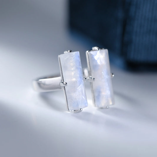 Baguette Cut Natural Moonstone Gemstone Engagement Ring 925 Sterling Silver Adjustable Band for Women Blue Stone Promsie Gifts