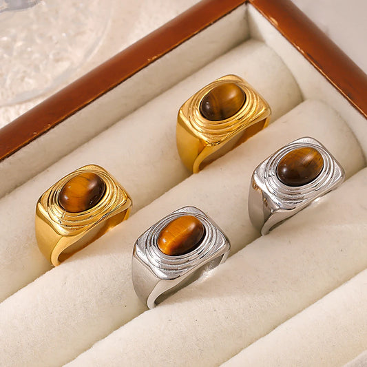 Nivora Stainless Steel Vintage Rings For Women Shiny Tiger's Eye Stone Cocktail Rings Women No Tarnish Jewelry Gifts