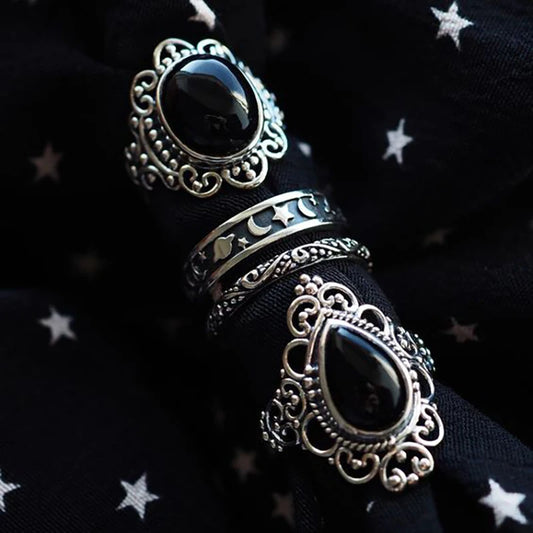 4 Pcs/Set Vintage Drop Water Elegant Black Agate Arabesques Antique Silver Color Ring Women Party Daily Adjustable Open Ring
