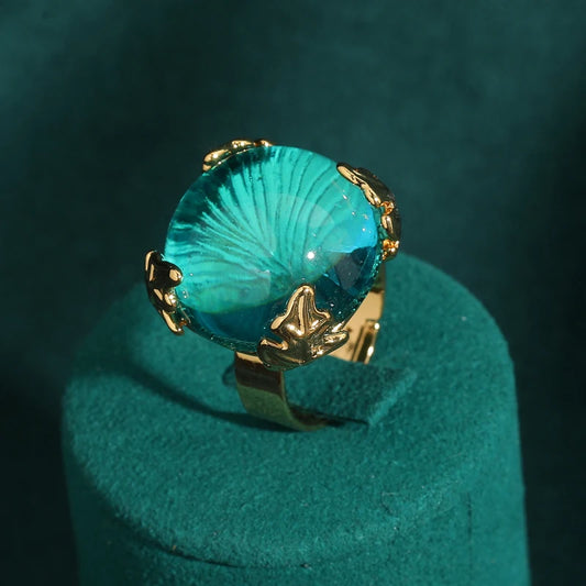 Vintage Round Blue Rings For Girls Glass Cat Eye Gold Color Luxury Brands Jewelry 2025 Trending Woman Antique Accessories
