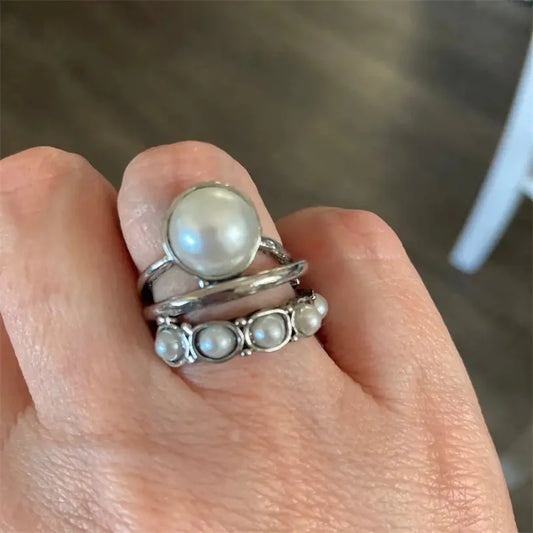 Vintage Oval Round Geometry Silver Color Imitation Pearl Adjustable Ring for Women Wedding Engagement Ring Jewelry