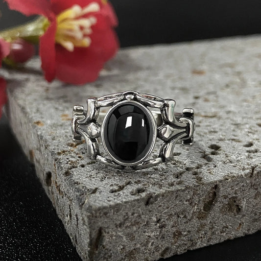 S925 Sterling Sliver Women's Ring with Natural Black Agate Moonstone Stone Hollowed-out 925 Sliver Fine Jewerly Rings for Women