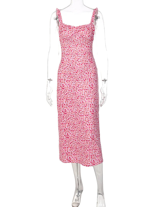 Hugcitar Ruffle Floral Print Sleeveless Backless Slip Draped Midi Dress Sexy Skinny 2025 Summer Outfit Streetwear Party Club Y2K