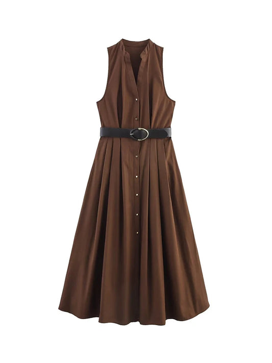 TFMLN New Summer Women's Midi Dress With Belt 2025 V Neck Sleeveless A-line Casual Single Breasted Dress Female Elegant Solid