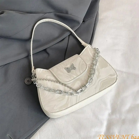 Fashionable Handbag Retro PU Leather Shoulder Bag with Butterfly Designs for Women Korean Solid Color Underarm Purse F42A