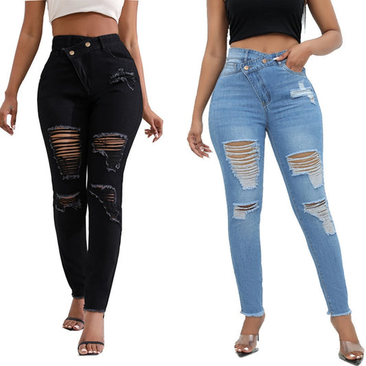 2024 New High Waist Diagonal Button Design Ripped Jeans For Women Fashion Stretch Slim Denim Pencil Pants Skinny Trousers XS-2XL