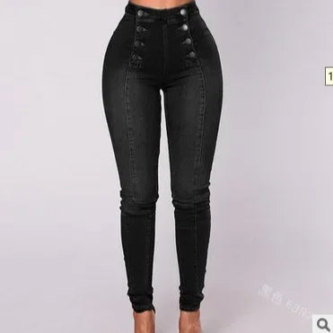 High Waist Casual Denim Pants Women's Elastic Multi-Buckle Trendy Double-Row Jeans Long Trousers Comfortable Stretchy Ladies
