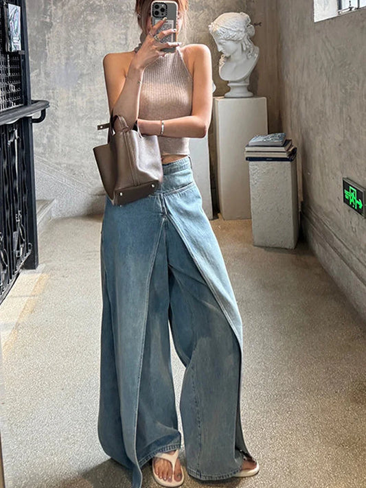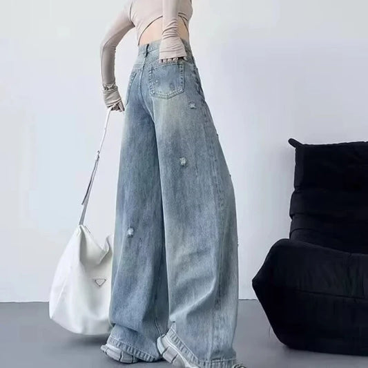 2024 Fashion Patchwork Wide Leg Jeans Women Mid Waist Loose Micro Flared Denim Pants Female Commuter Trousers Casual Streetwear