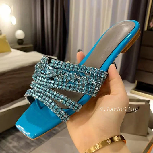 Summer Shiny Rhinestone Decor Flat Slippers Women's Square Toe Hallow Outs Casual Sandals Outdoor Vacation Beach Shoes 2025