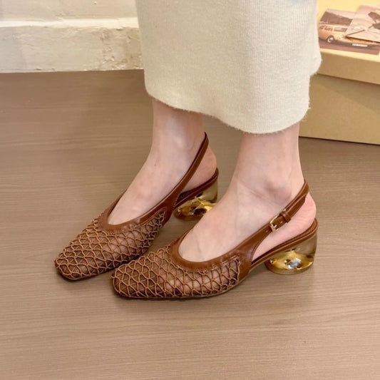 French Temperament Square Head Braided Bag Head Backspace Sandals Spring and Summer New Fashion Crystal Single Shoes Dark Brown