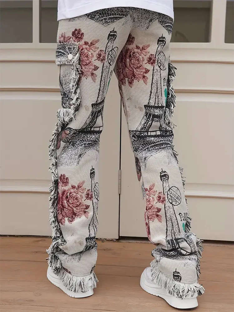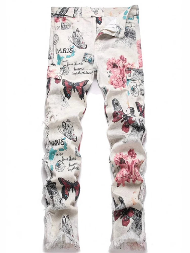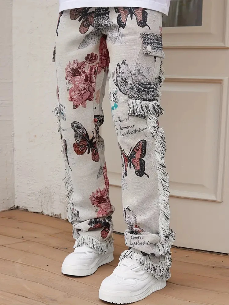 2025 Spring Summer Streetwear Jeans Mens Vintage Butterfly Print Straight Jean Pants Men Stylish Tassel Designer Denim Trousers