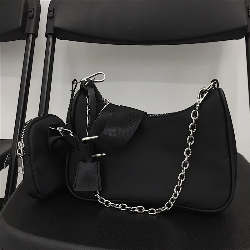 Casual nylon waterproof women shoulder hobo bags fashion cool black chain decolr armpit crossbody with small purse