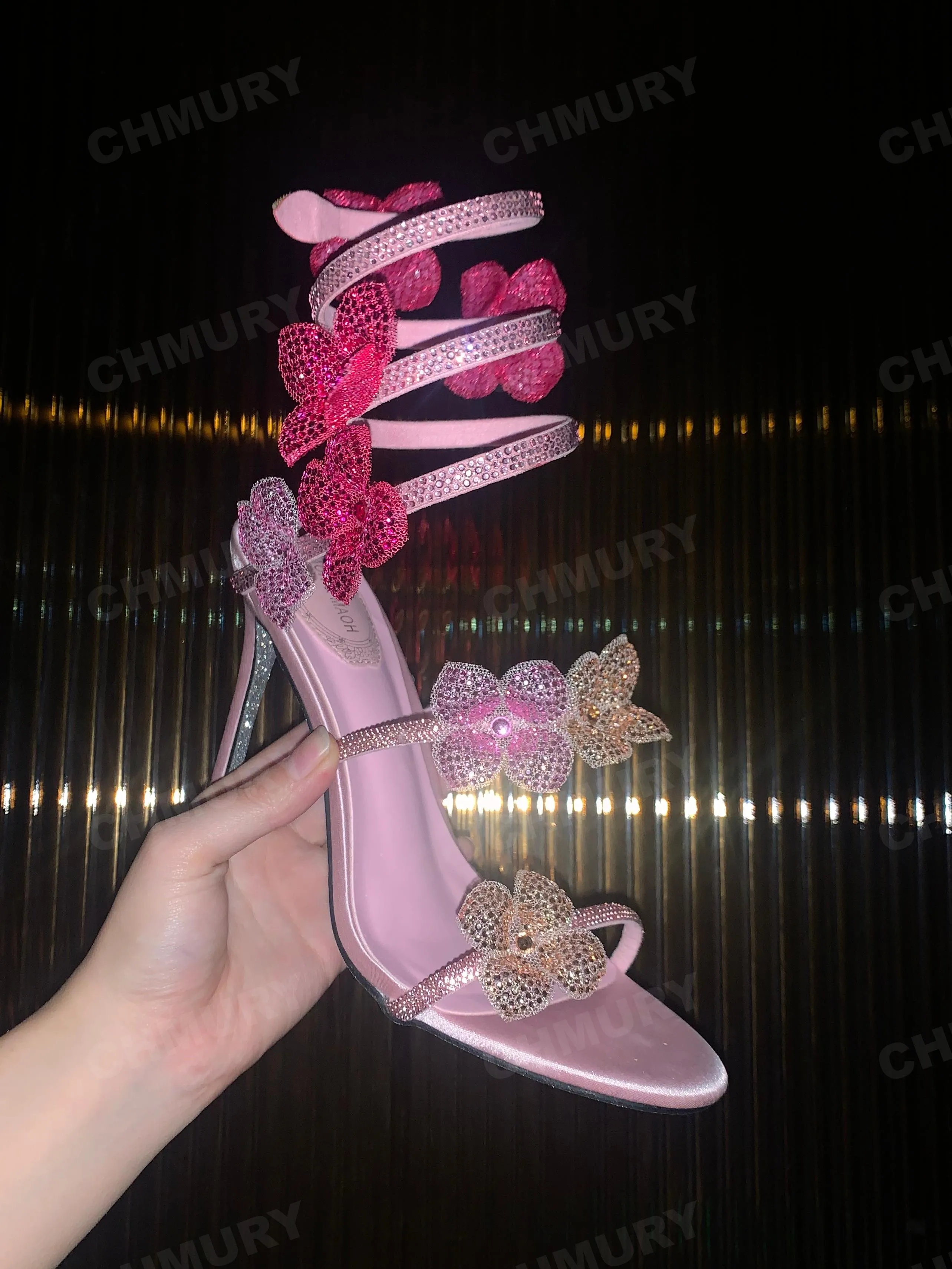 CHMURY Pink Flower Rhinestone High Heels Sandals Shoes Sexy Rose Red Luxury Designer with Wrap Strap for Women Prom Party 2024