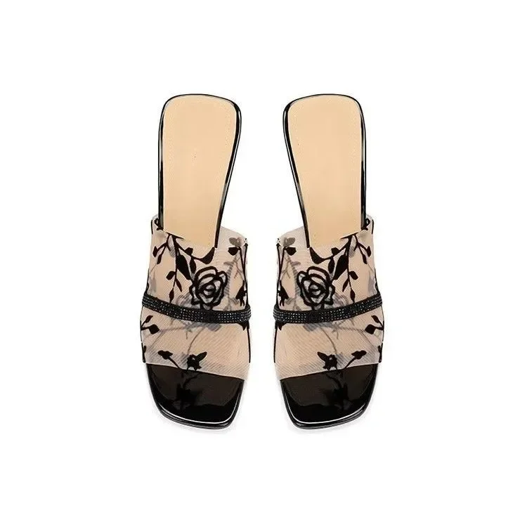 Design Sense: Niche Cool Slippers, Women's Slim Heels, Sexy and Charming Mesh, Chinese Style Floral High Heels, Exposed Toes