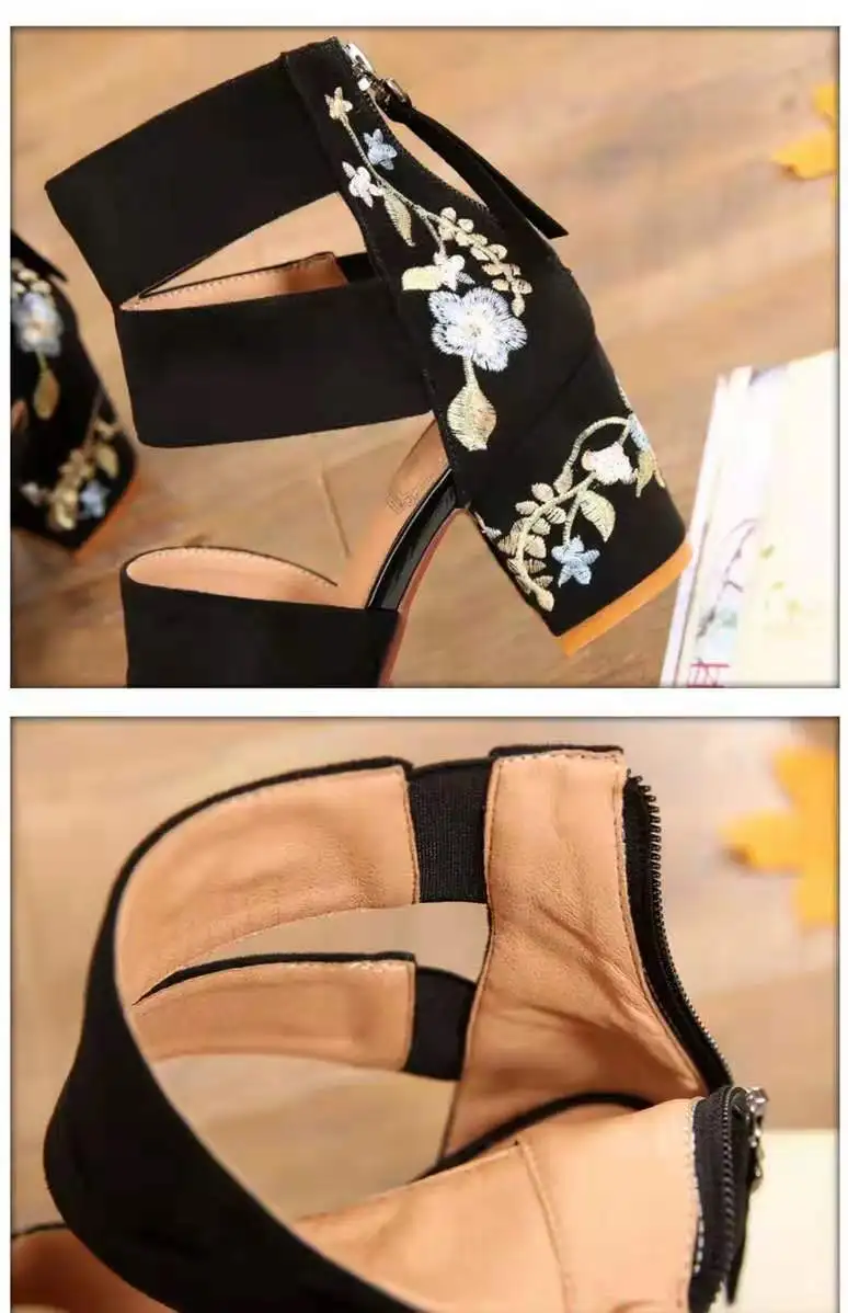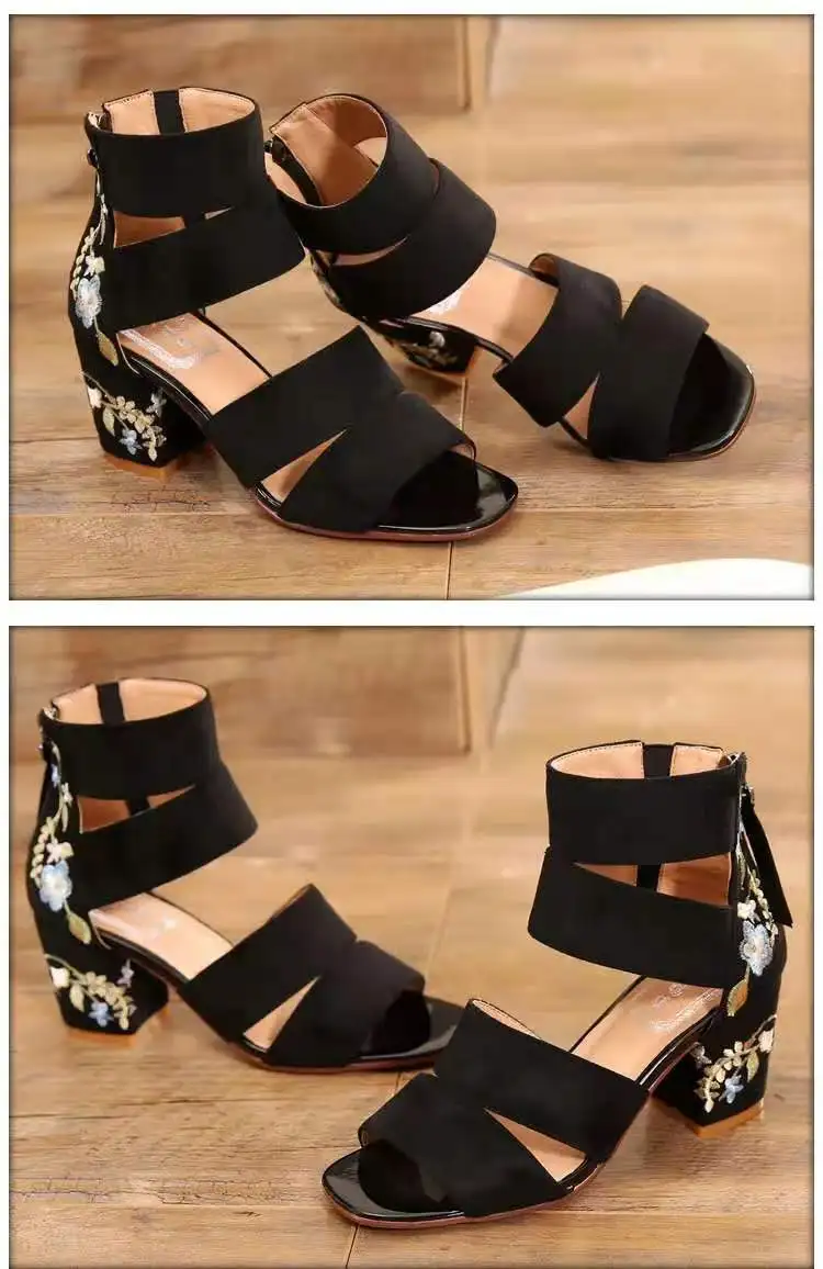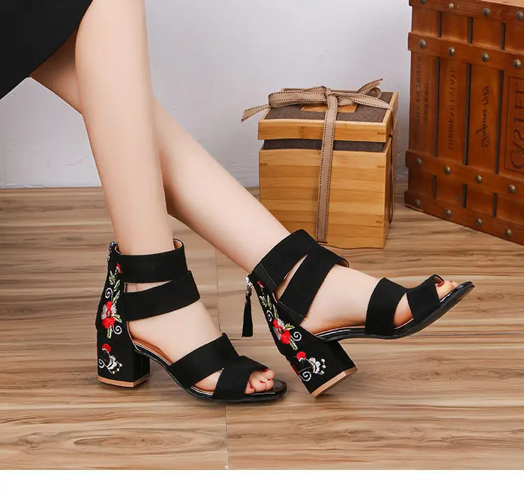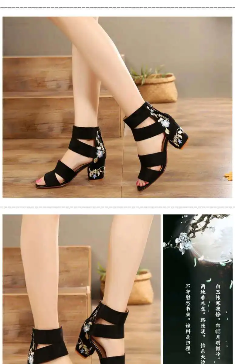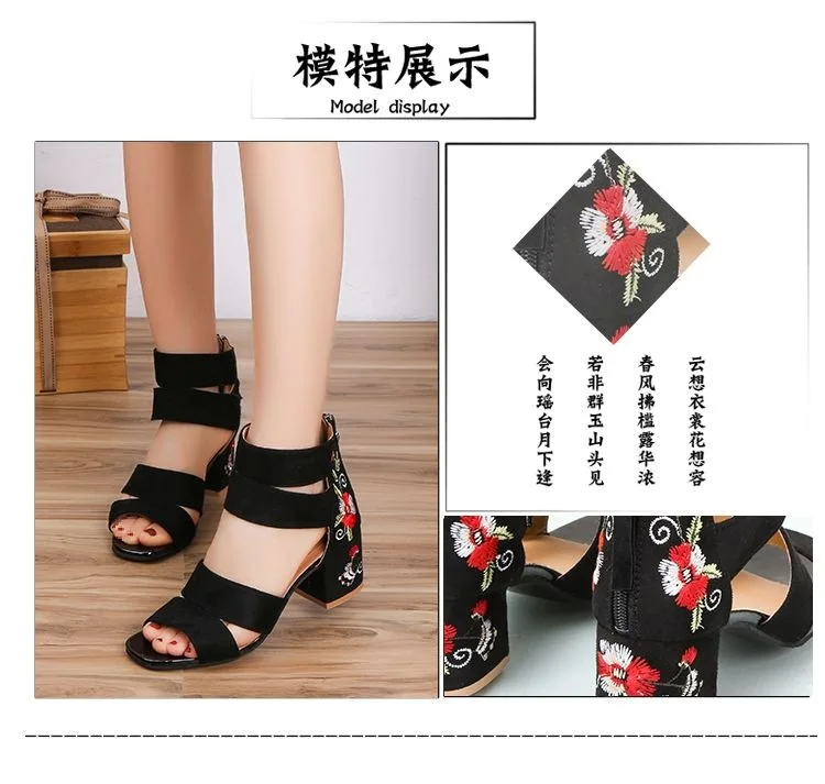 Ethnic Style Embroidered Mid-heel Sandals, Summer Casual Thick Heels Elegant Vintage Open-toed Embroidered Shoes, Women's Shoes