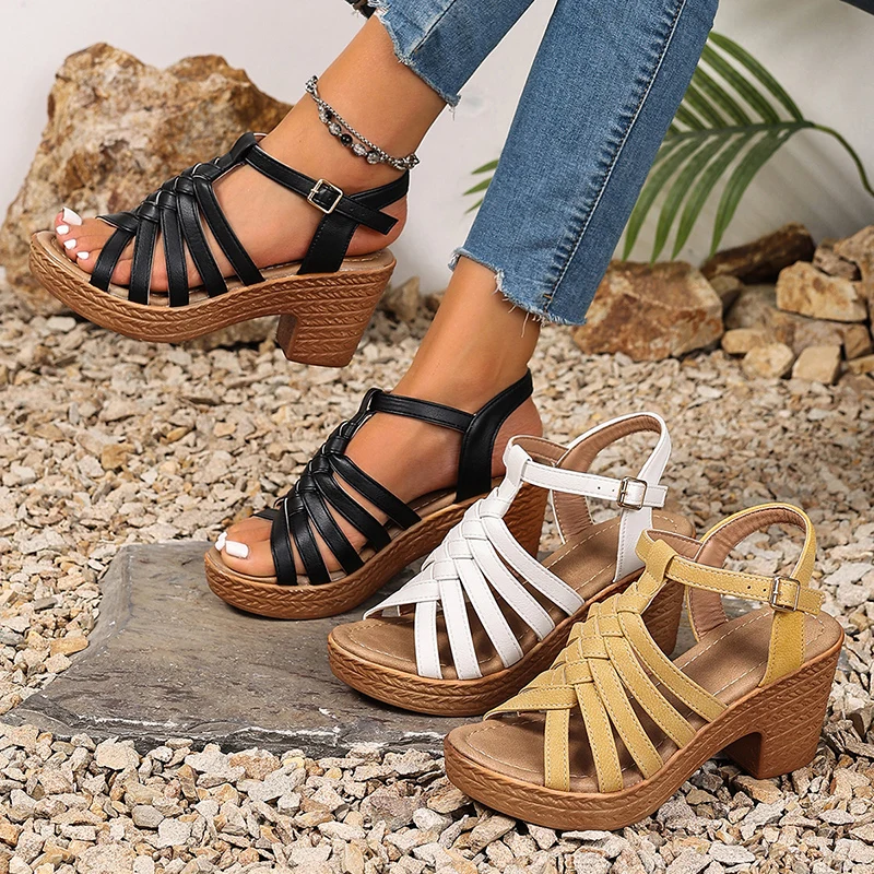 Fashion Woven Straps Chunky Heel Sandals Women Summer Ankle Buckle High Heeled Rome Shoes Woman Open Toe Platform Sandles 36-42