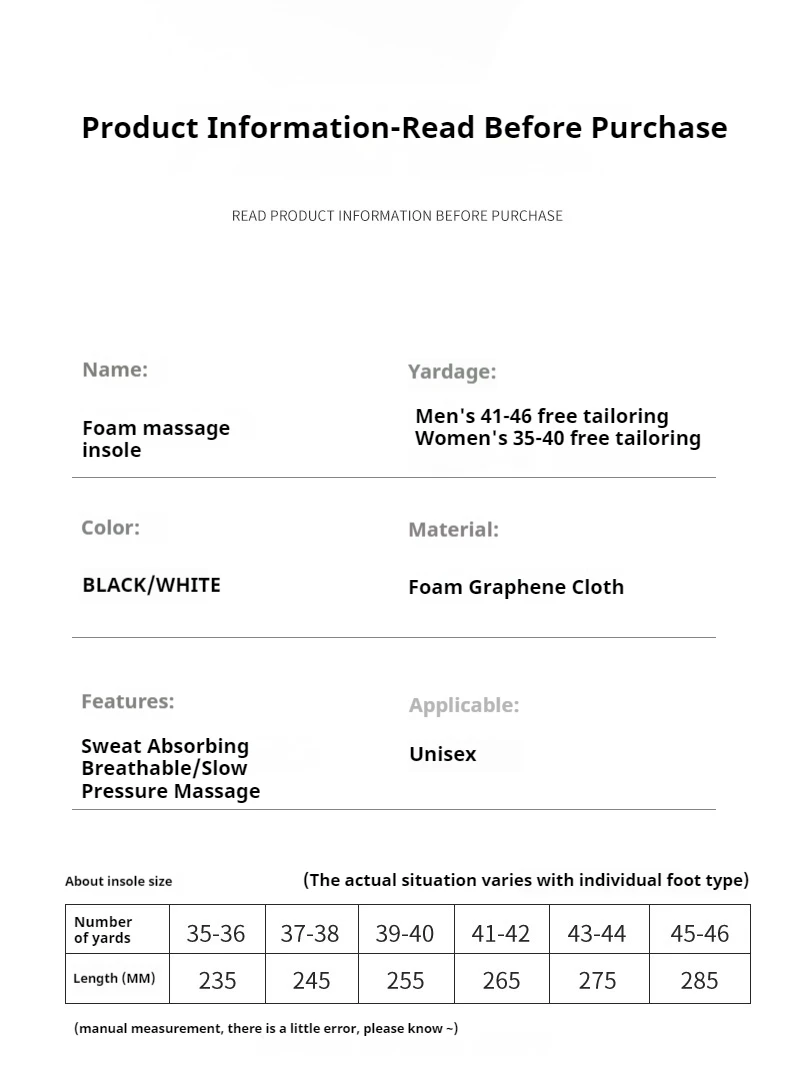 2.Free cutting size : In order to meet the needs of different shoe types and personal foot shapes, this insole supports free cutting. You can easily adjust it to the most suitable size according to the actual shoe size, ensuring a perfect fit and not afraid of the trouble of size mismatch.