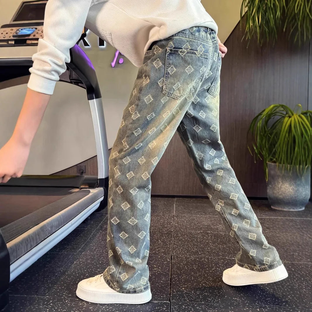 Light Blue Full Print Jacquard Jeans for Men, Niche Design, Curved Knife Pants, American High Street Vibe Straight Leg Pants