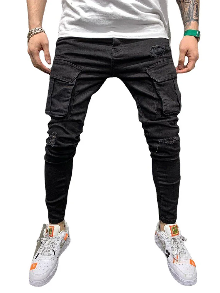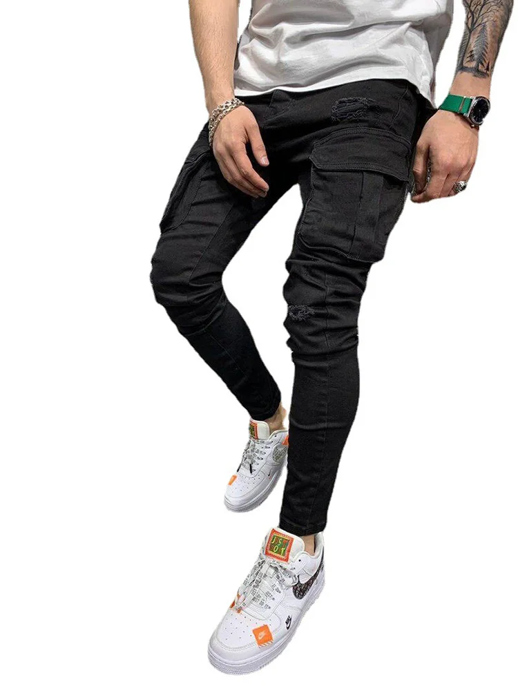 Men Wash Solid Color Multiple Pockets Holes Mid Waist Cargo Pants Trousers Slim Fit Daily Wear Joggers Street Elastic Jeans