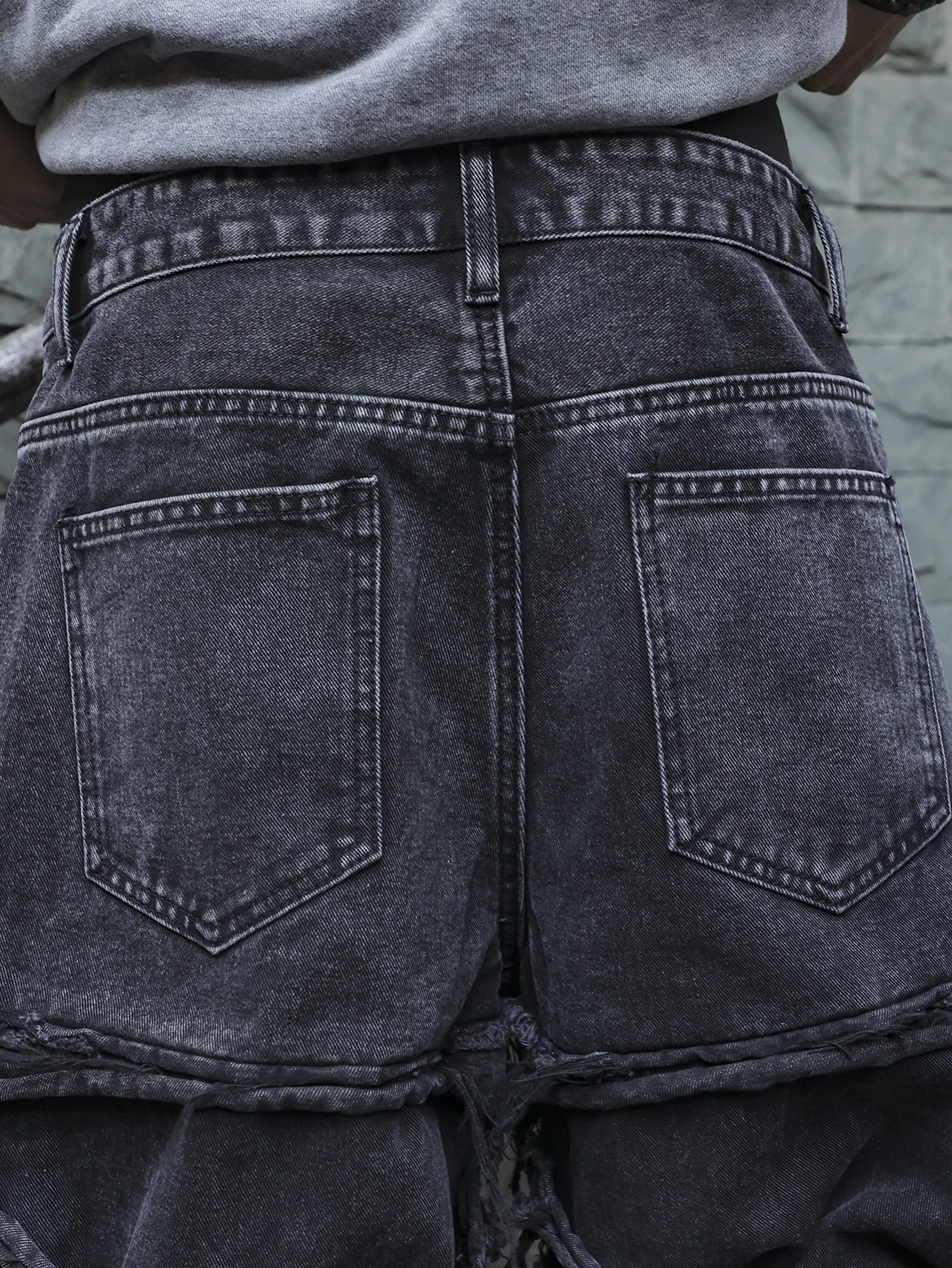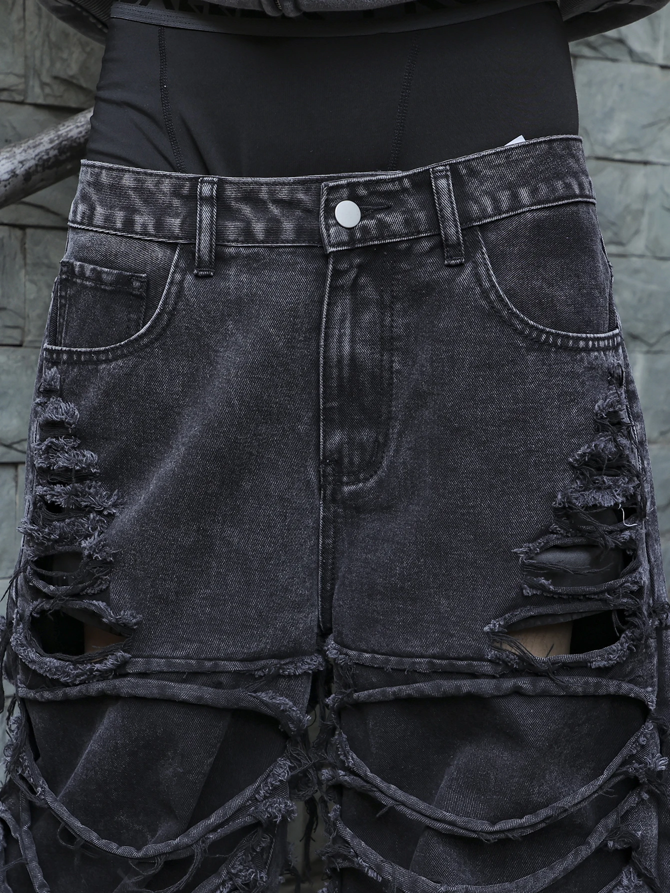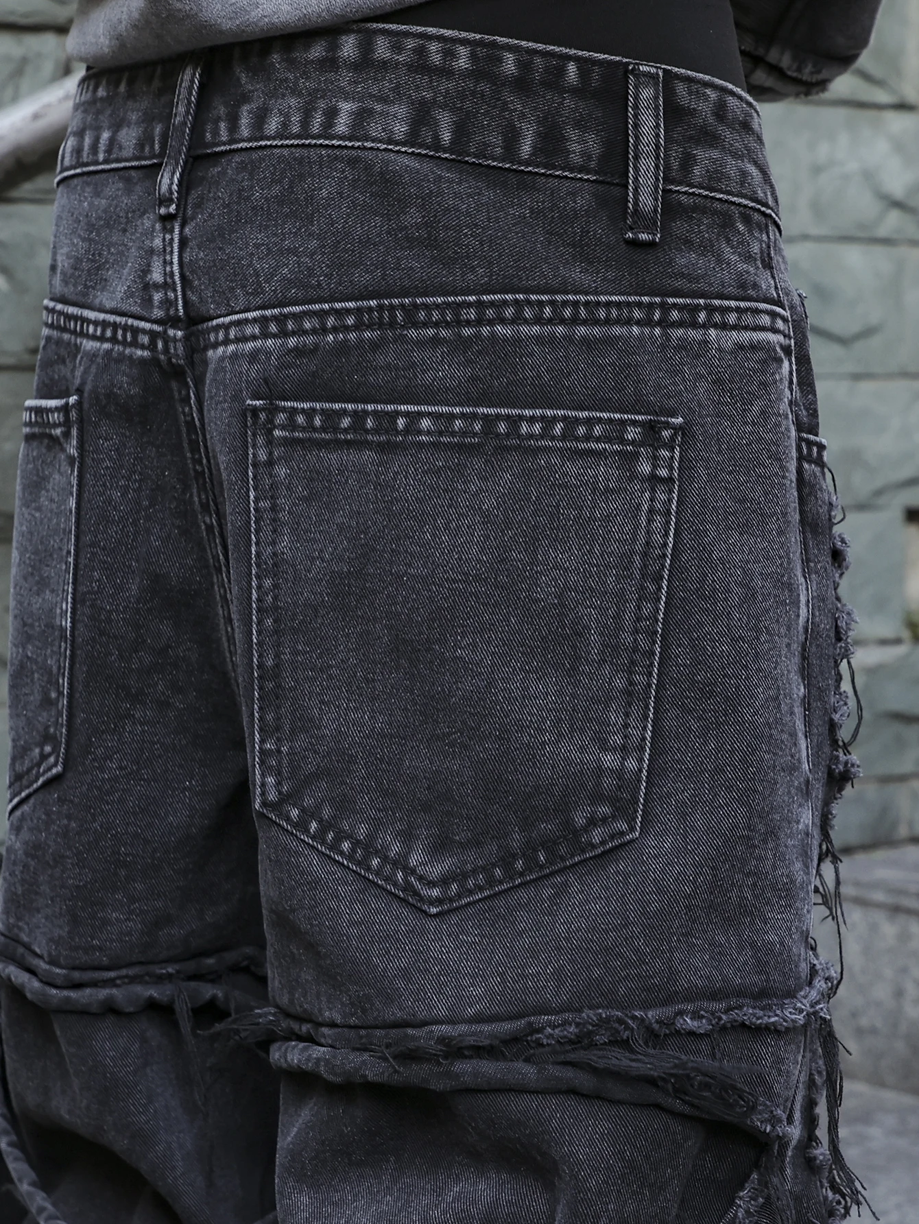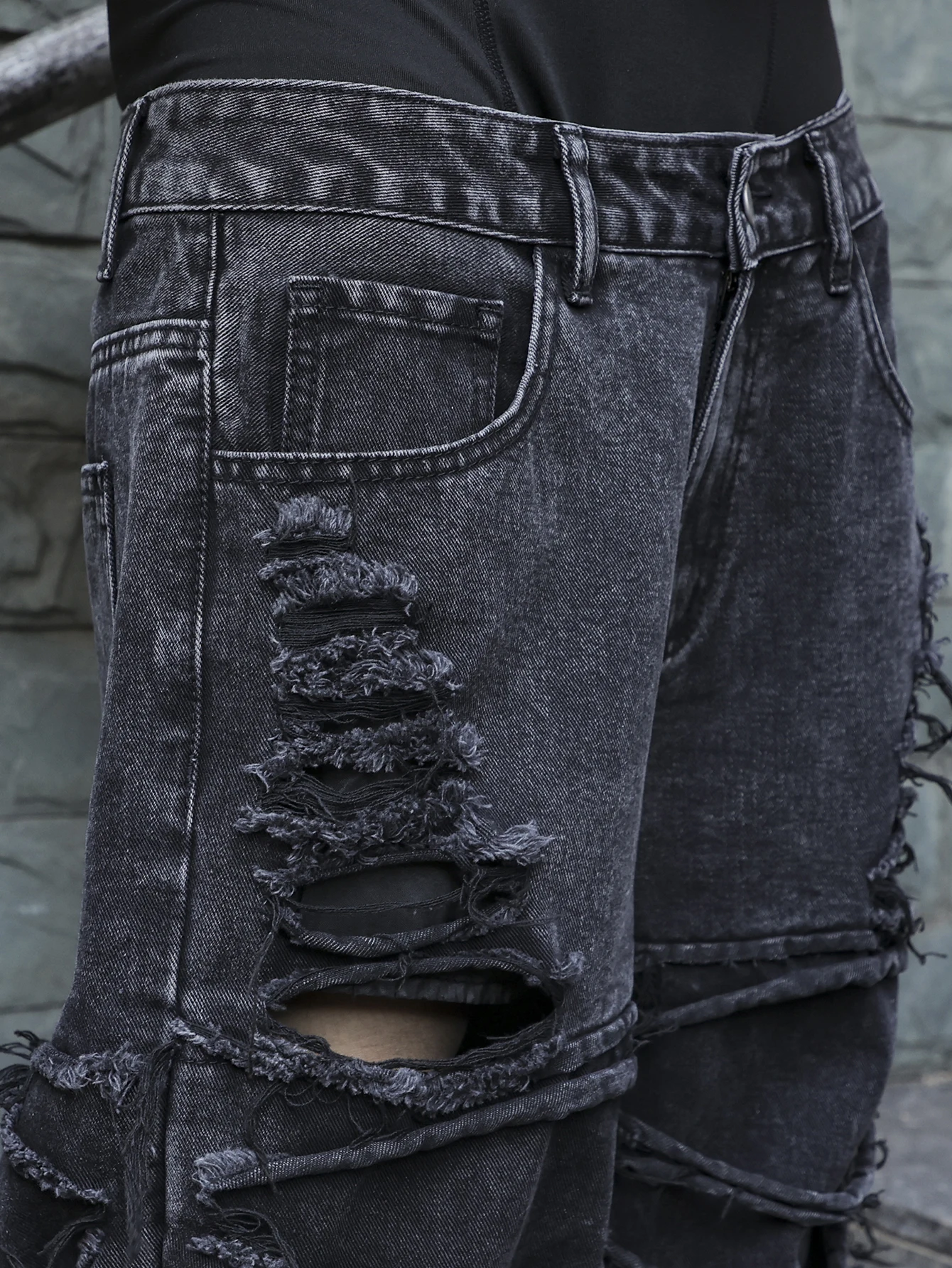 Men's black jeans. Jeans with (ripped) and tassel designs belong to street (streetwear) style clothing. This style emerged from the street culture of New York in the 1970s, integrating elements of hip-hop, punk, and other influences. The ripped and tassel designs break the formality of traditional jeans, emphasizing individuality and a rebellious spirit, and showcasing a unique aesthetic through deliberate distressing and irregular treatments. In terms of styling, they can be paired with simple solid-color T-shirts and functional-style jackets, and complemented with trendy skate shoes or thick-soled sneakers to highlight an unruly street (streetwear) attitude.