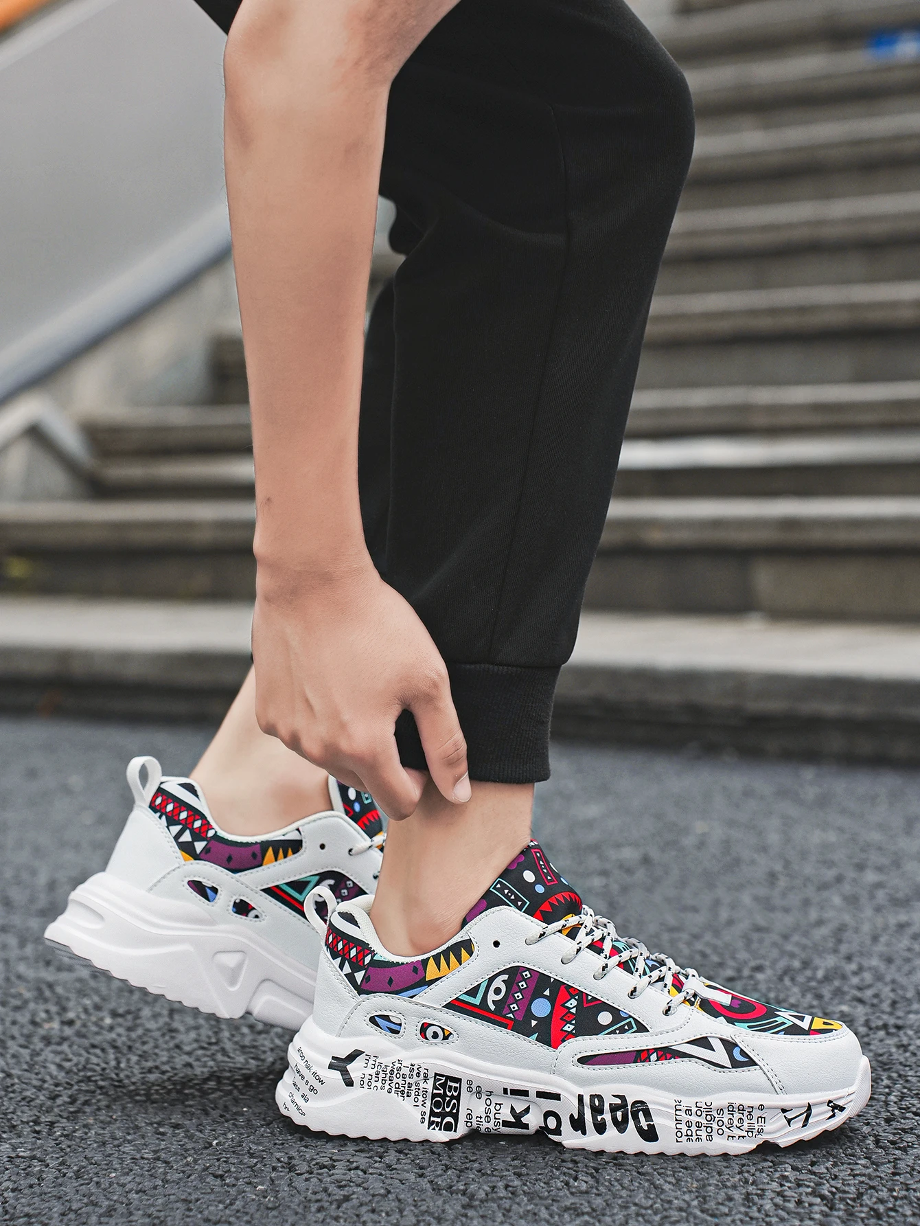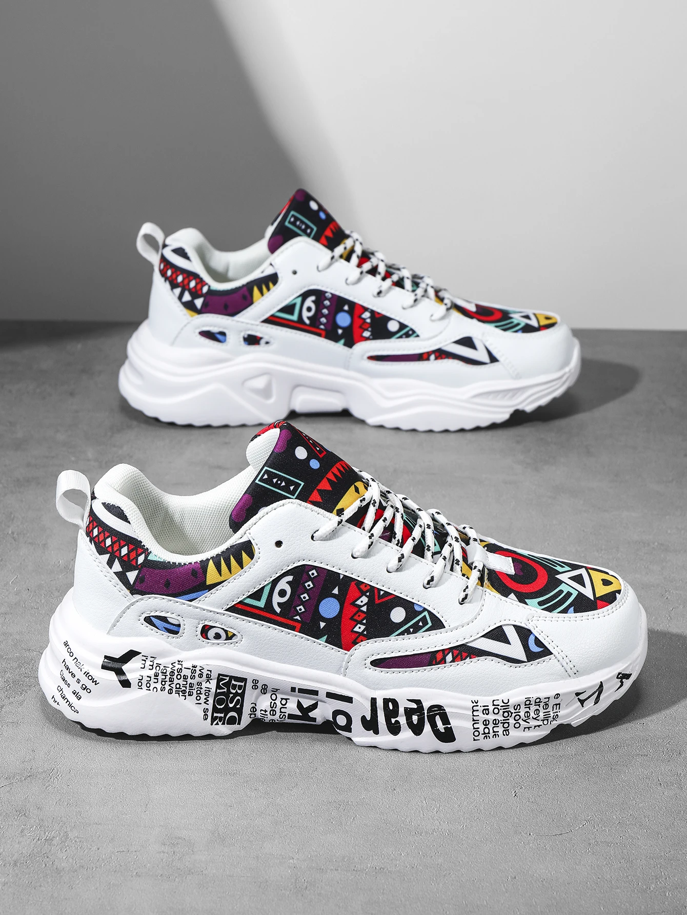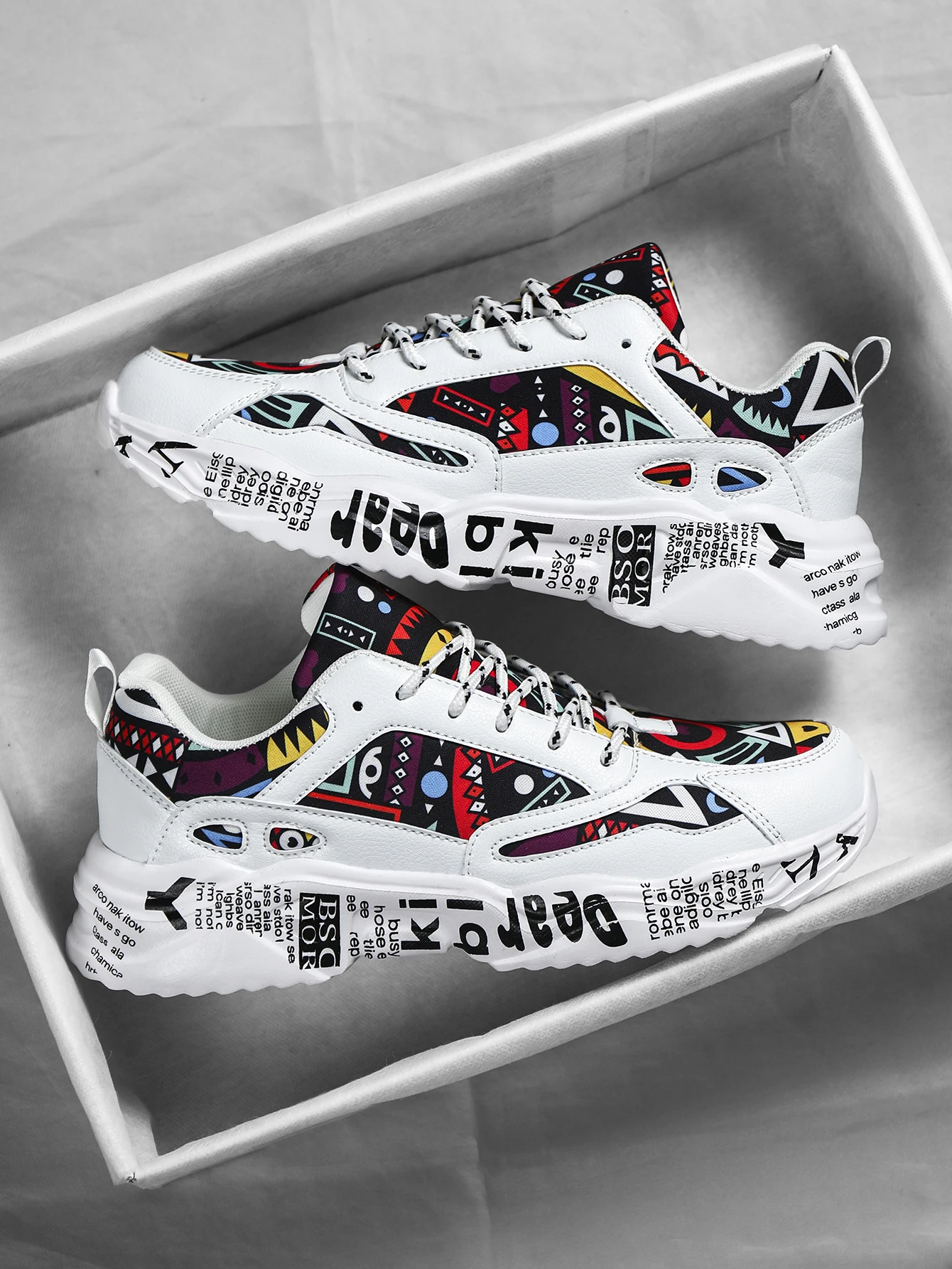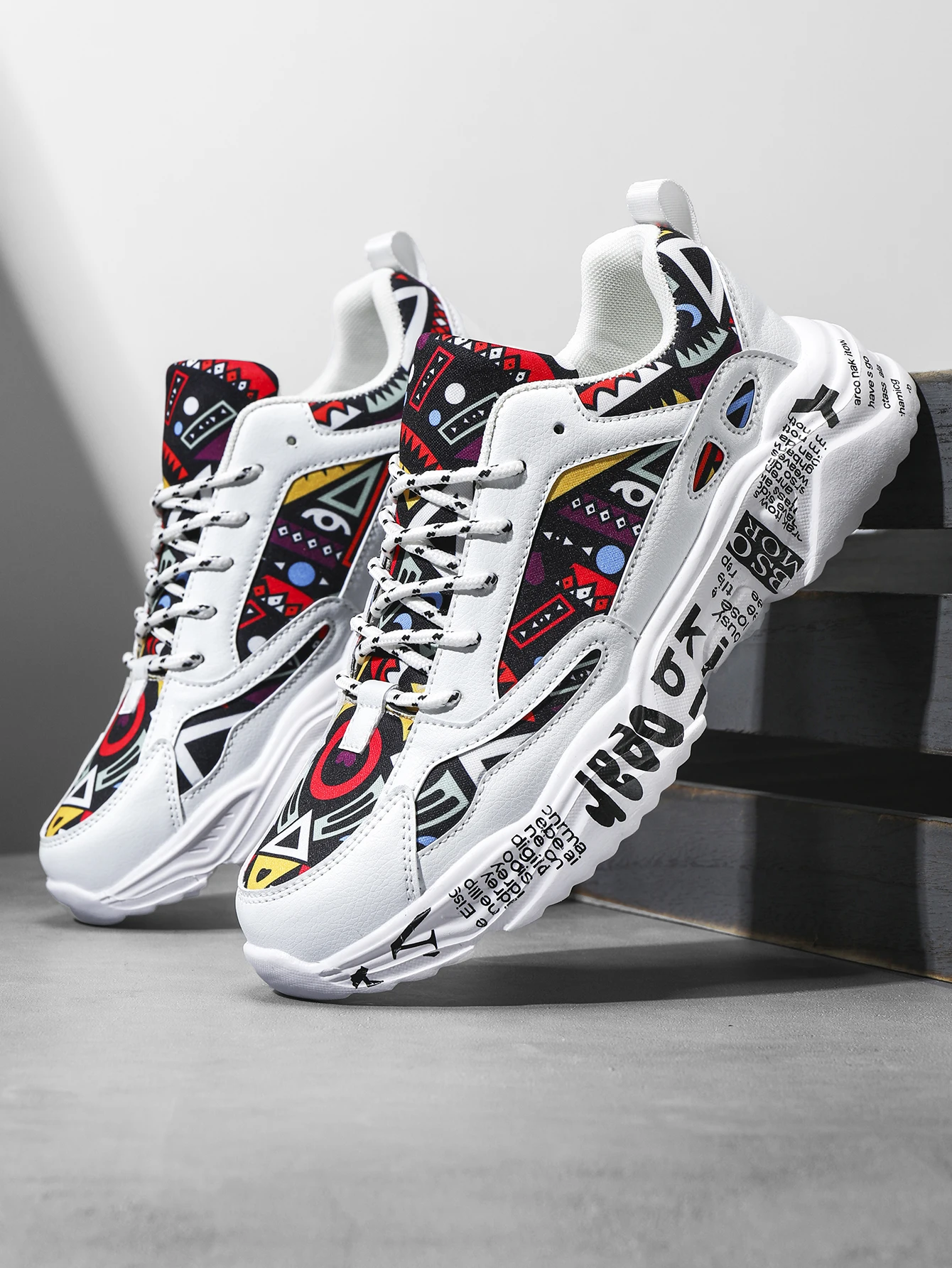Men's Fashionable and Trendy Random Graffiti Contrasting Letter Stickers Dad Shoes, Comfortable Daily Versatile Casual Couple Sneakers