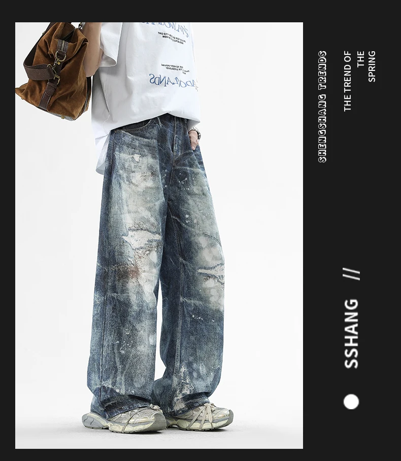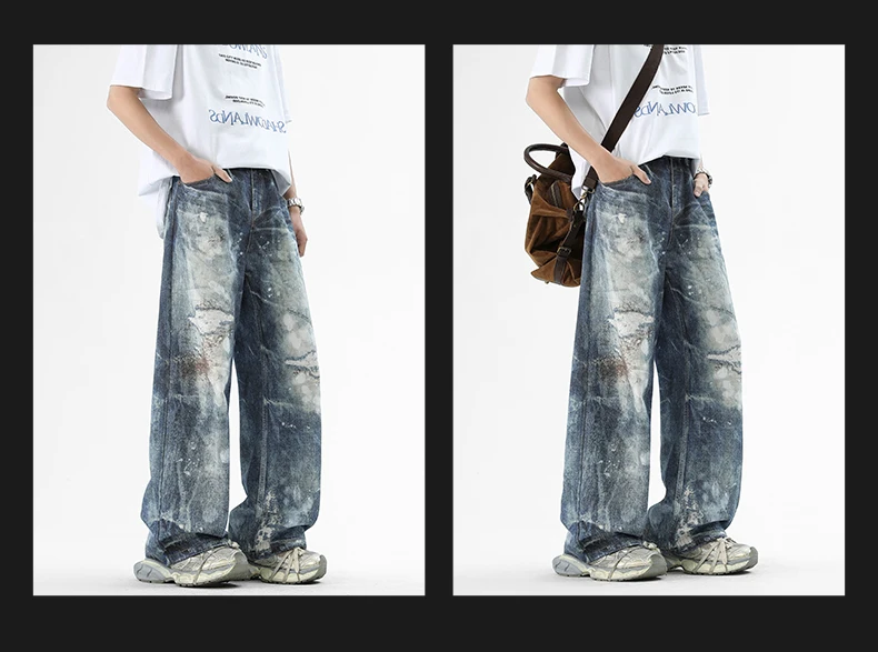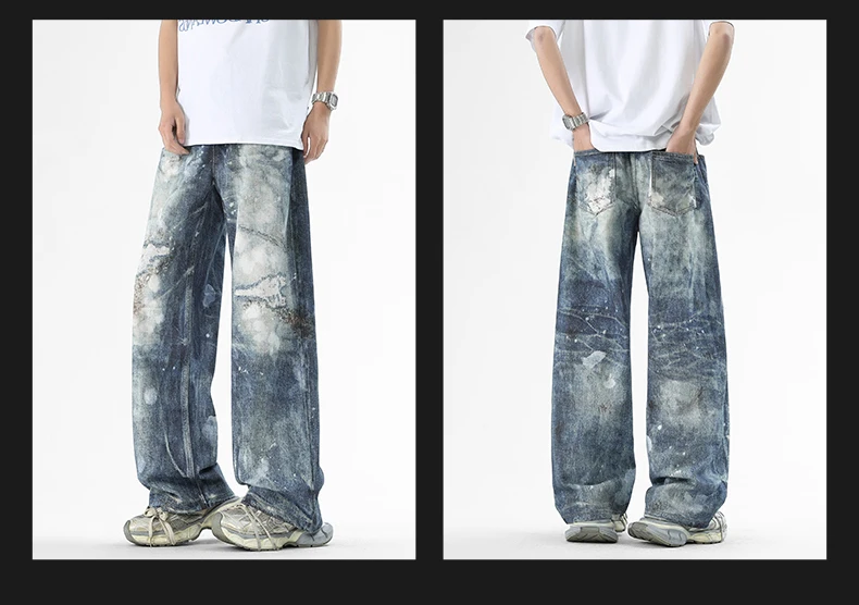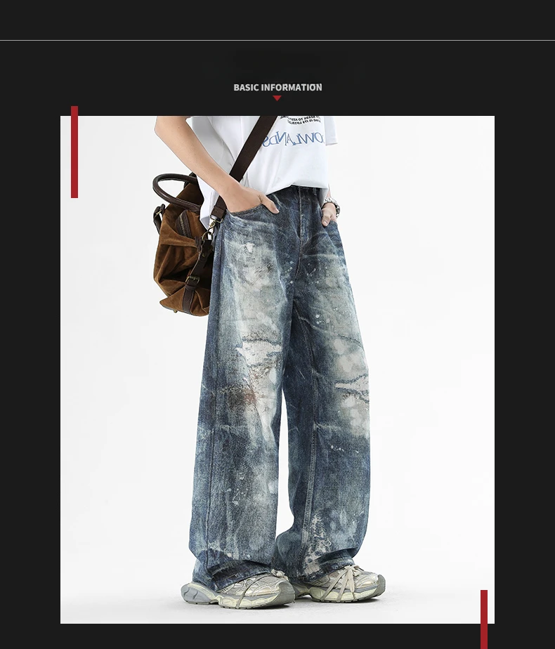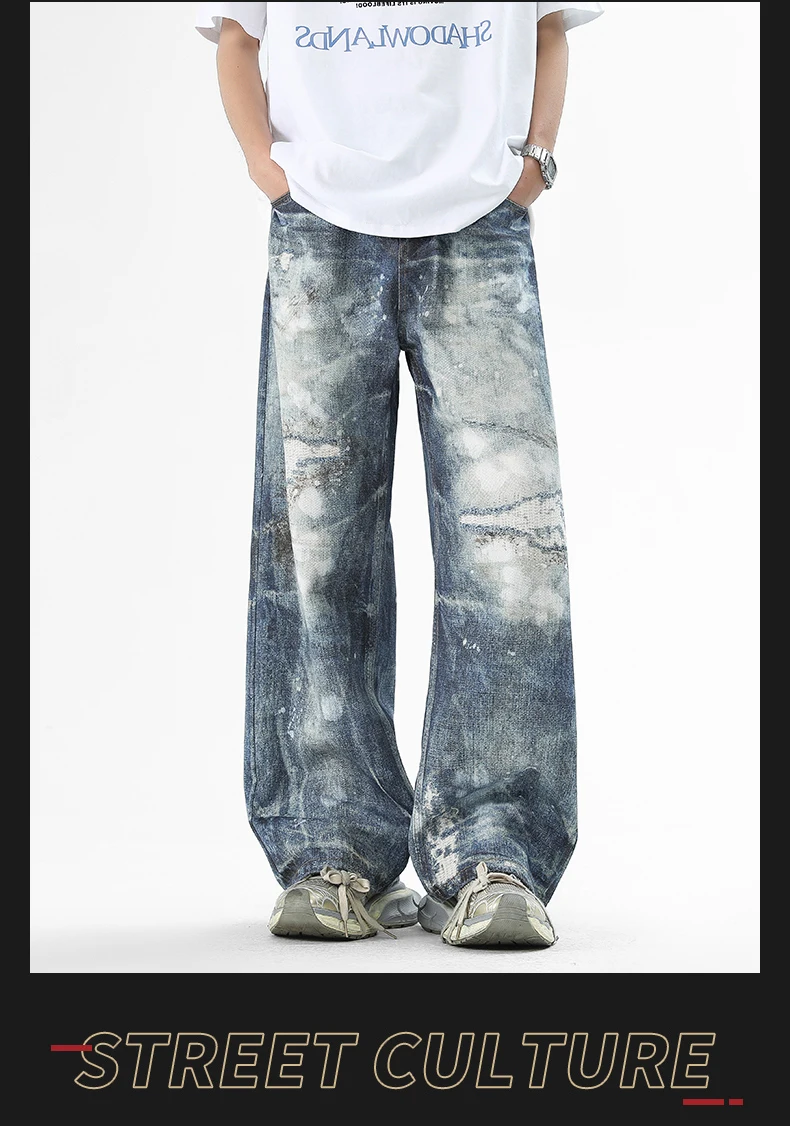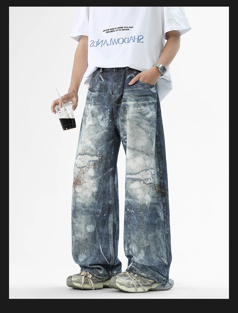 Mens Washed High Street Retro Pants Splashing Ink Color Piercing Printed Jeans High Street Trendy Brand Men Clothing Baggy Jeans