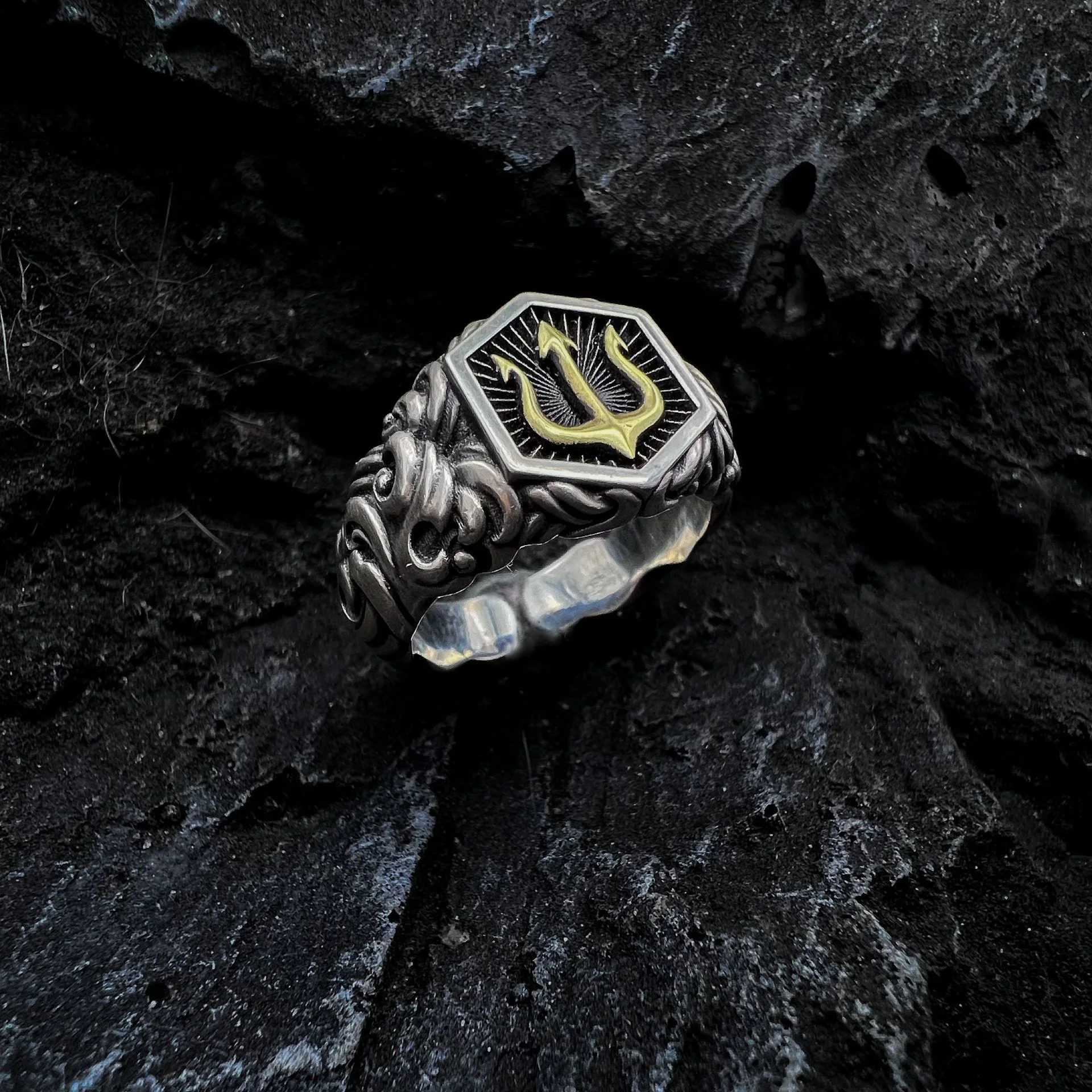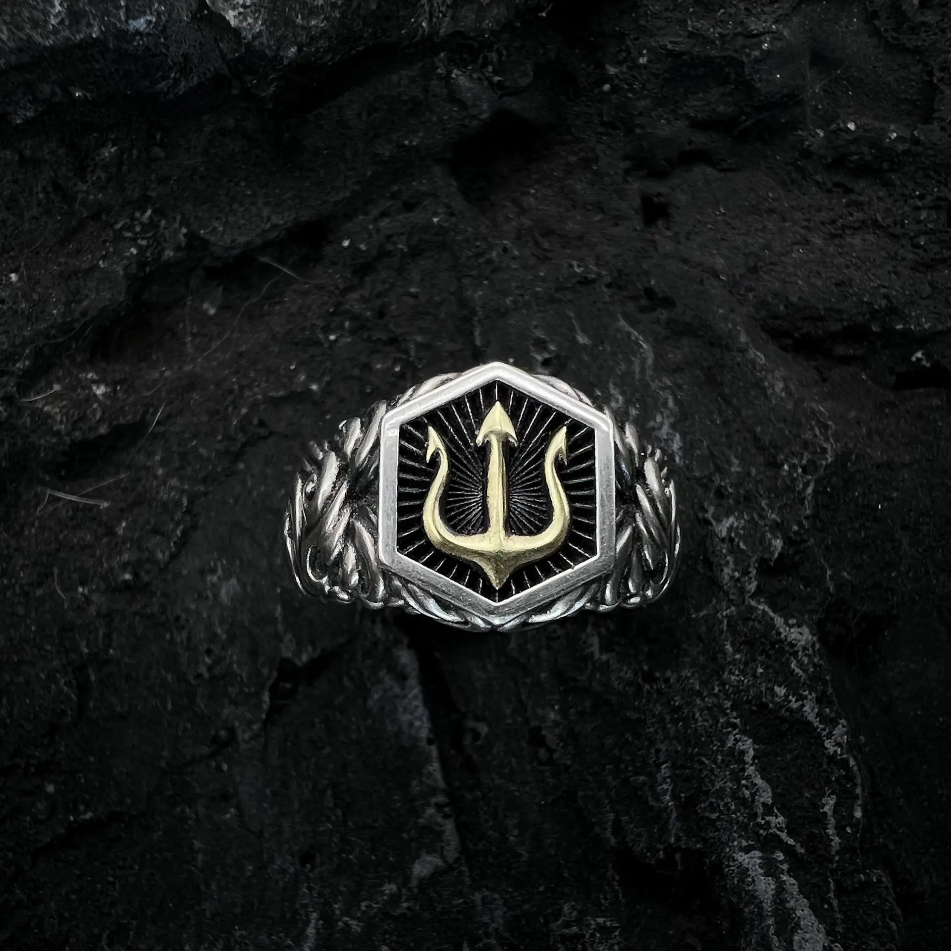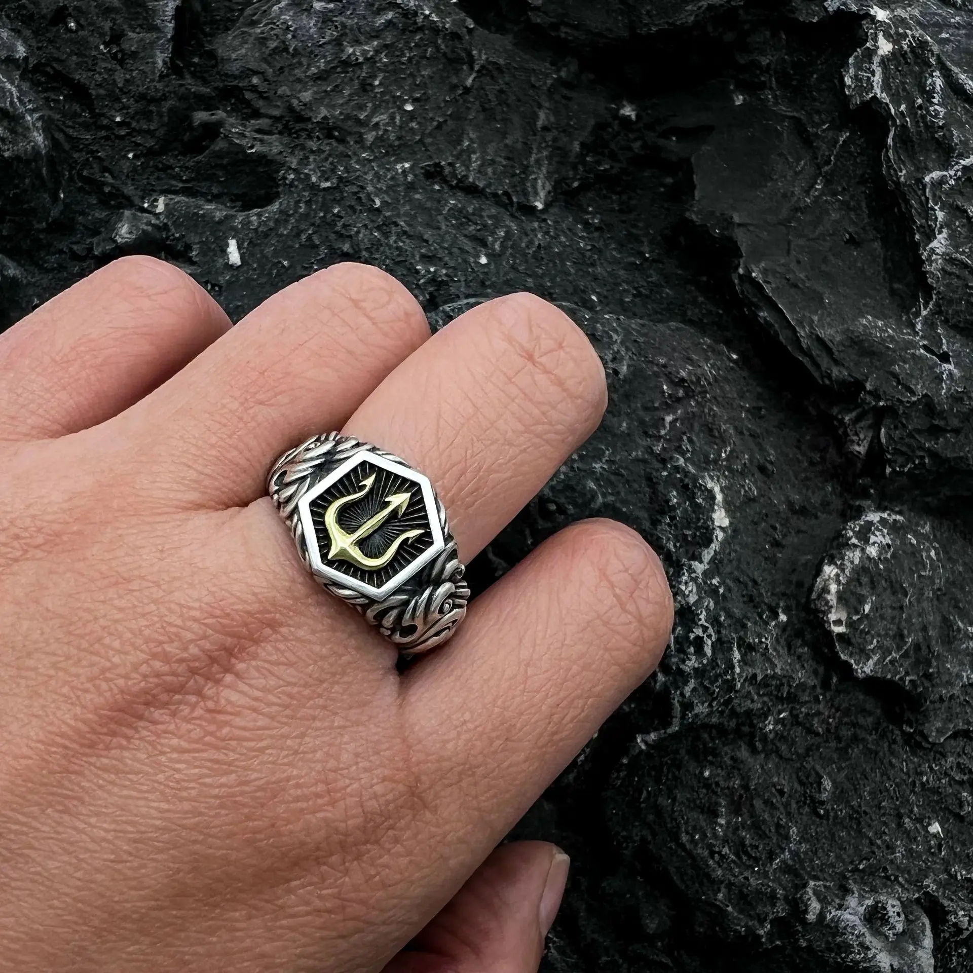Retro Poseidon Golden Trident Ring For Men Punk Gothic Rock Hiphop Open Ring Handmade Unisex Jewelry Bikers Accessories Man Gift