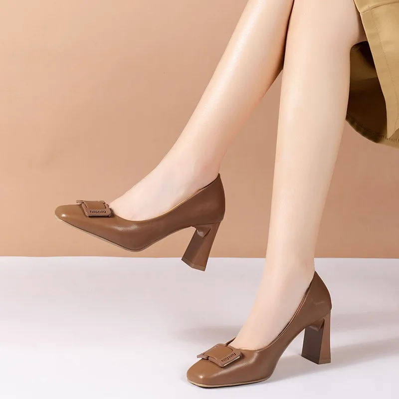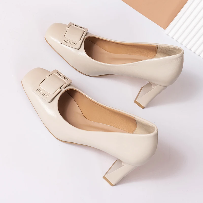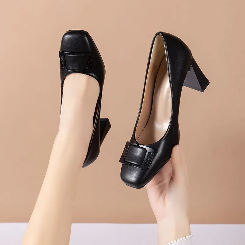 Spring new square head thick heels women's shallow mouth buckle single shoes professional shoes high heels