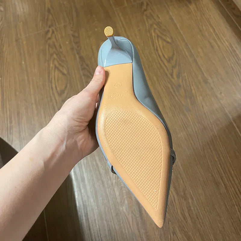 Women 7cm High Heels Pumps Lady Scarpins Fetish Nightclub Blue Nude Low Heels Wedding Party Metal Chain Buckle Fetish Prom Shoes